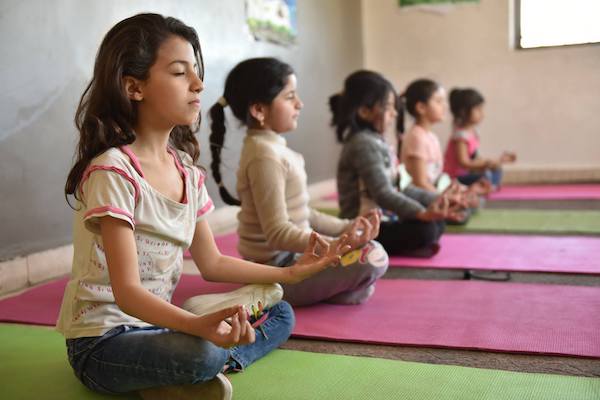 Emad, the young man who volunteers as the yoga leader, was trained in yoga instruction at the CPR center. His training includes trauma-sensitive yoga training. He smiled and supported the kids as they laughed and enjoyed some familiar yoga positions and tried some new ones too. Emad was sensitive with the kids and gave each child individual attention and assisted them with their yoga positions, while they often giggled with pleasure. I could see he was aware of each child and accepted their unique needs and abilities. I can’t imagine when these refugee children have been through but as I looked around the room I saw kids in the peaceful environment, enjoying their yoga workout, while relaxing, amused with each other and enjoying the time on their yoga mats.”